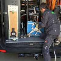 Auf der linken Seite des Sprinters wurde ein Modul für Kleinteile und eine Klappwerkbank verbaut. Die rechte Seite wurde mit Zurrschienen und Haken für Schläuche, Starkstromkabel und einem Hochdruckreiniger ausgestattet.